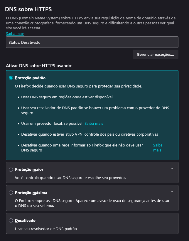 OBS: O Mozilla Firefox bloqueará o acesso ao site se na configuração de privacidade, e na opção de Ativar DNS sobre HTTPS estiver selecionado Proteção Máxima.